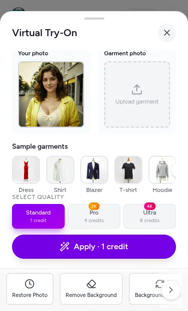 The Virtual Try-On tool is designed specifically for outfit replacement. It applies new clothing to your image while preserving your body shape, pose, and facial features.